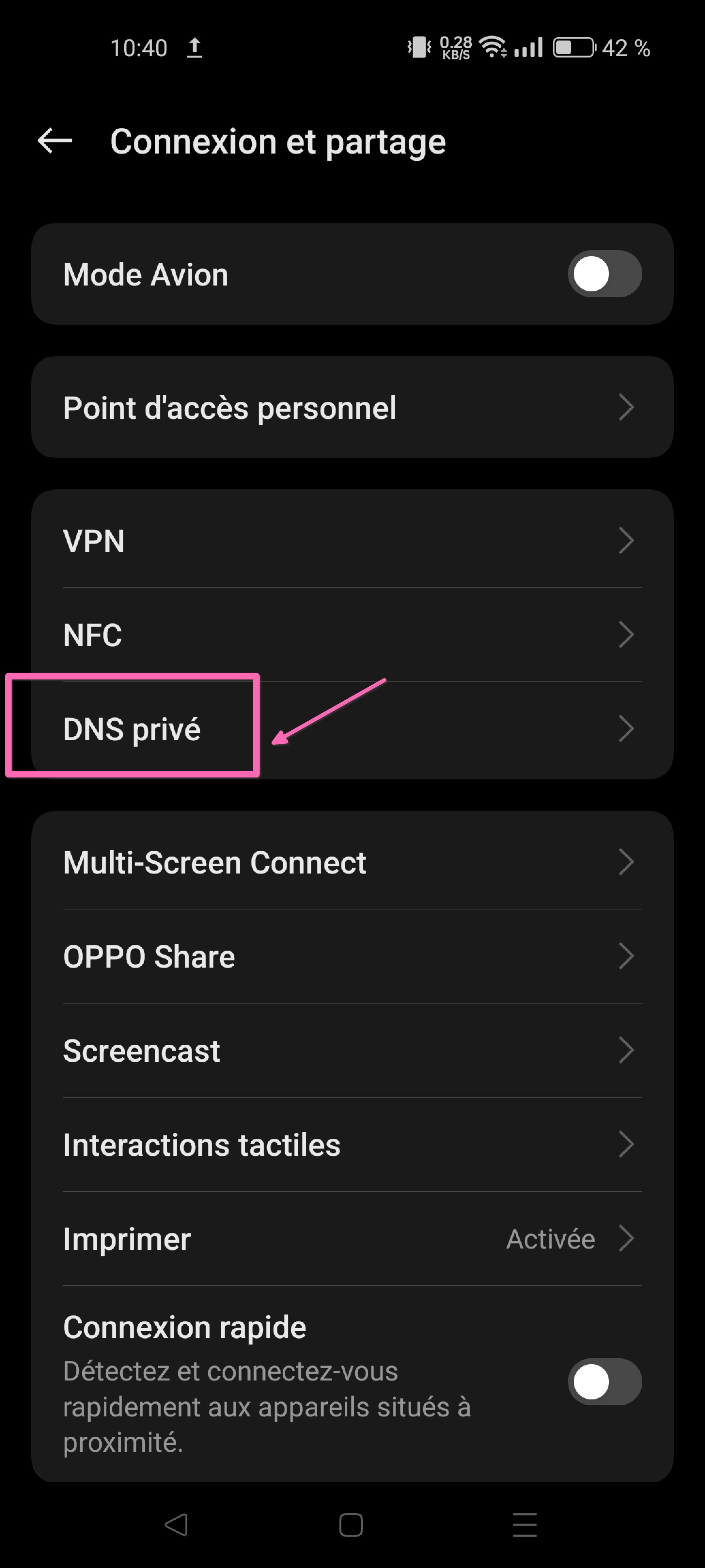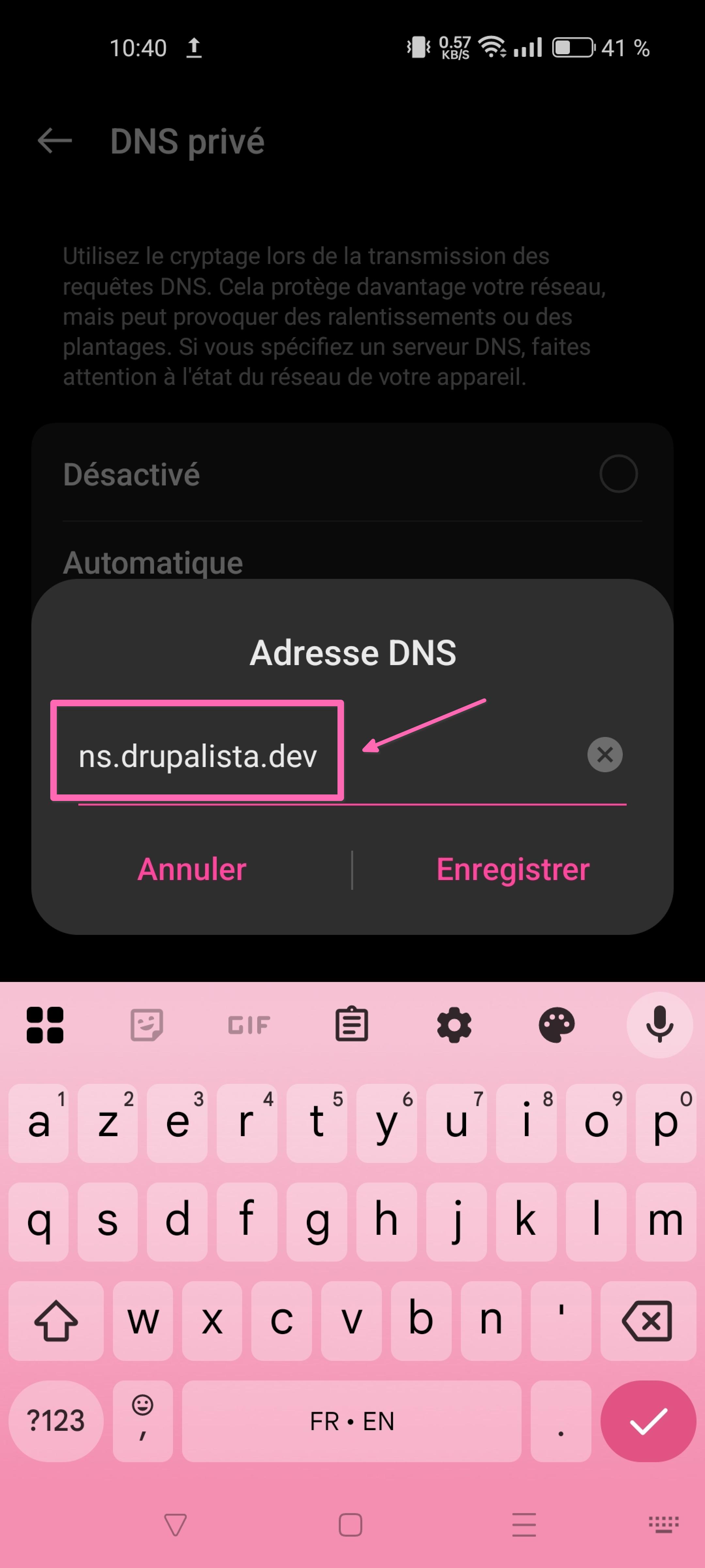 Sur Android, l'accès à la configuration DNS privé, peut varier selon les ordiphones. Étape 1 Image Cliquez sur la roue crantée pour accéder aux paramètres de l'appareil Étape 2 Image Sélectionnez "Connexion et partage". Étape 3 Image Sélectionnez "DNS privé" Étape 4 Image Sélectionnez "DNS Spécifié" Étape 5 Image Renseignez l'adresse ns.drupalista.dev et enregistrez